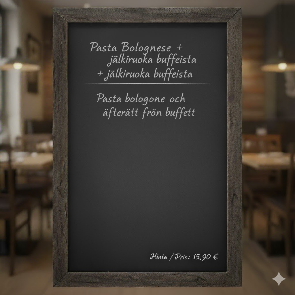 Pasta Bolognese + jälkiruoka buffetista Pasta bolognese och äfterrätt från buffett